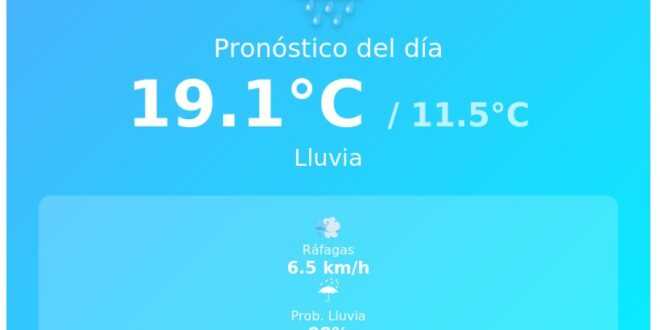 El Servicio Meteorológico Nacional informa que para este Domingo 22 de Marzo en Neuquén Capital, la temperatura máxima prevista es de 19.1°C y la mínima de 11.5°C, con pronóstico de lluvia.