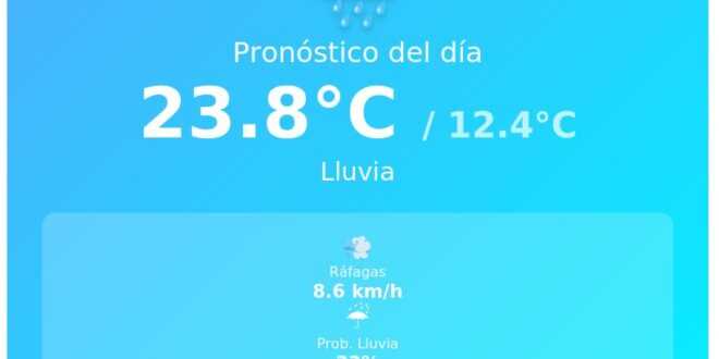 La temperatura actual ronda los 13.4°C. Se esperan máximas de hasta 23.8°C y mínimas de 12.4°C. El viento será leve, con ráfagas que no superarán los 8.6 km/h. El índice UV se sitúa en 5.4, considerado moderado.