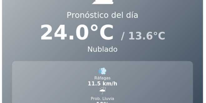 La temperatura actual al momento del reporte es de 15.3°C. Se espera que la máxima alcance los 24.0°C y la mínima descienda hasta los 13.6°C. El viento soplará con ráfagas de hasta 11.5 km/h, sin representar un factor significativo para la jornada. El índice UV se ubica en 5.85, considerado moderado.