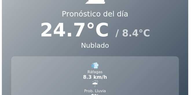 La temperatura máxima alcanzará los 24.7°C, mientras que la mínima descenderá hasta los 8.4°C. El viento será leve, con ráfagas que no superarán los 8.3 km/h. El índice UV se mantiene moderado.