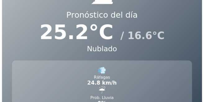 La temperatura actual es de 18.3°C. Se espera que la máxima alcance los 25.2°C, mientras que la mínima se ubicará en 16.6°C. El viento se hará sentir con ráfagas que podrían llegar hasta los 24.8 km/h.