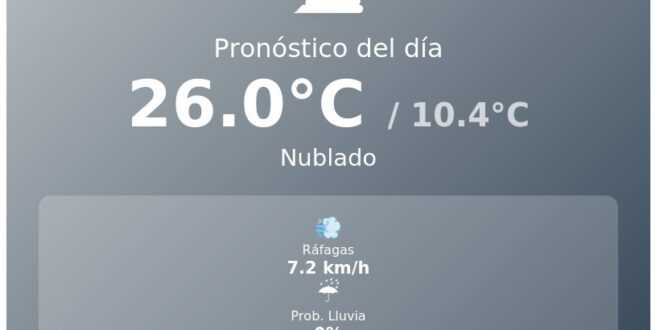 La temperatura actual es de 12.0°C. Se anticipa que la máxima alcanzará los 26.0°C, mientras que la mínima se situará en 10.4°C. El viento será leve, con ráfagas que no superarán los 7.2 km/h. El índice UV será de 5.4, considerado moderado.