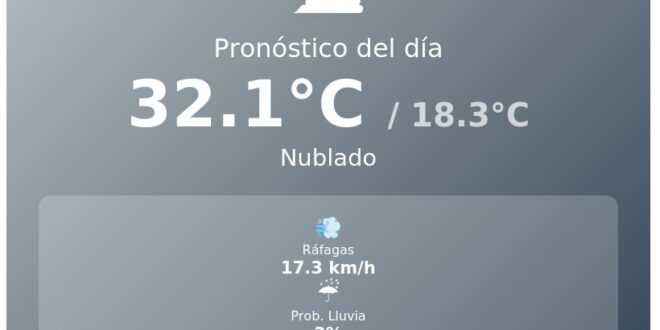 La temperatura máxima pronosticada para hoy es de 32.1°C, mientras que la mínima se registrará en 18.3°C. El viento soplará con ráfagas que alcanzarán hasta los 17.3 km/h, sin representar un riesgo significativo. El índice UV se mantiene en 7.7, indicando radiación alta.