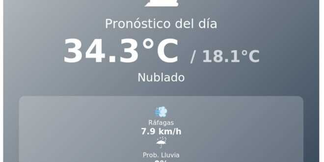 La temperatura máxima pronosticada es de 34.3°C, con una mínima de 18.1°C. El viento se presentará con ráfagas que alcanzarán los 7.9 km/h, lo que no representa una complicación mayor para las actividades al aire libre. El índice UV se mantiene alto, en 7.6.